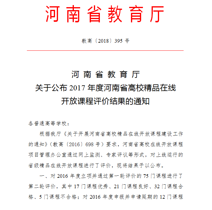 近日,河南省教育厅公布了2017年度河南省高校精品在线开放课程评价结果,我校陈月琴教授负责的《临床护理实践技能》及王福青教授负责的《生理学》课程分别获得“优秀”和“良好”评价。
